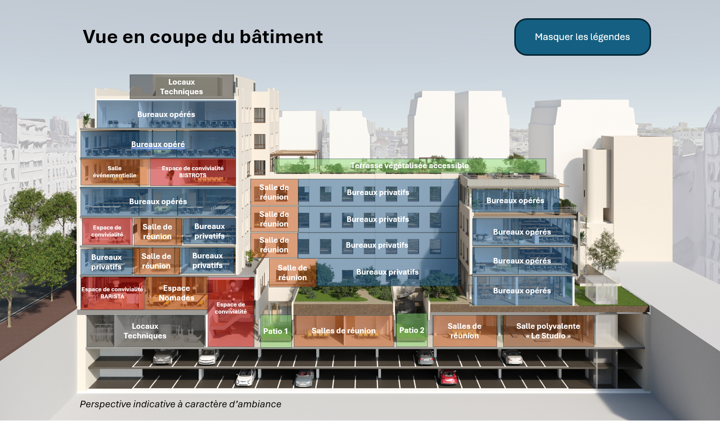 Tous ces espaces bénéficient par ailleurs des services suivants : accès internet haut débit, ménage régulier, imprimantes multifonctions, gestion du courrier et des colis, douches et vestiaires, ainsi que d'espaces kitchenette.